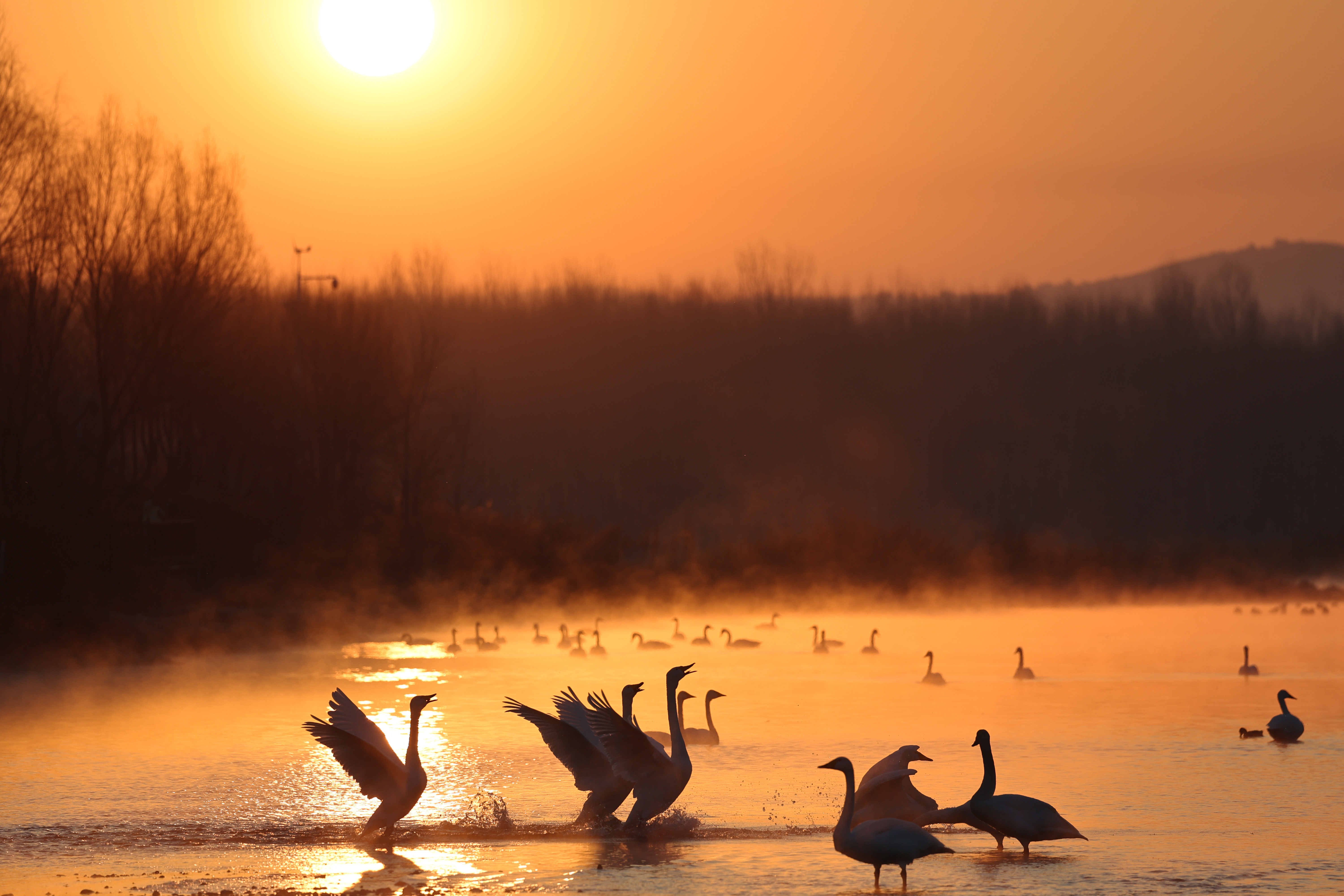 3月12日清晨,天鹅在辽宁省北票市红村天鹅湾栖息。